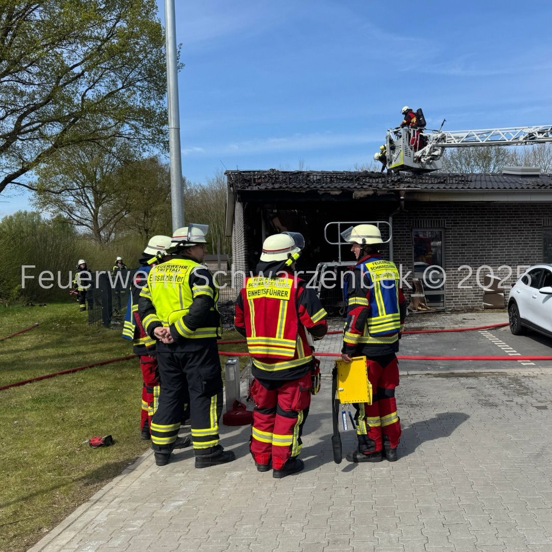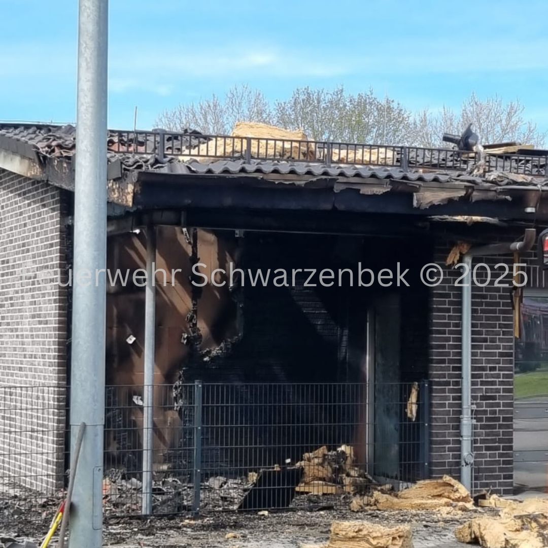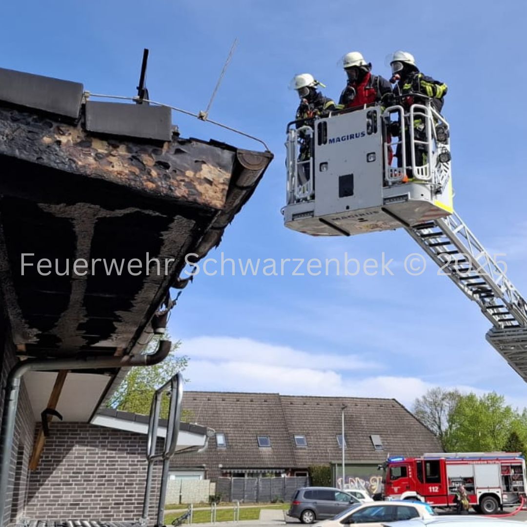 Mit dem Stichwort "Feuer, größer als Standard – Fassade brennt" wurden wir am 24.04.2025 um 10:42 Uhr durch die Leitstelle Süd gemeinsam mit den Feuerwehren aus Trittau, Grande und Witzhave nach Trittau alarmiert. Beim Eintreffen der ersten Kräfte stellte sich die Lage als Brand eines Unterstands bzw. eines Fassadenbereichs heraus. Das Feuer hatte sich bereits in den Dachstuhl ausgebreitet. Wir unterstützten vor Ort bei der Brandbekämpfung über unsere Drehleiter. Im weiteren Einsatzverlauf wurden weitere Glutnester entdeckt, wodurch sich die Nachlöscharbeiten deutlich verlängerten.