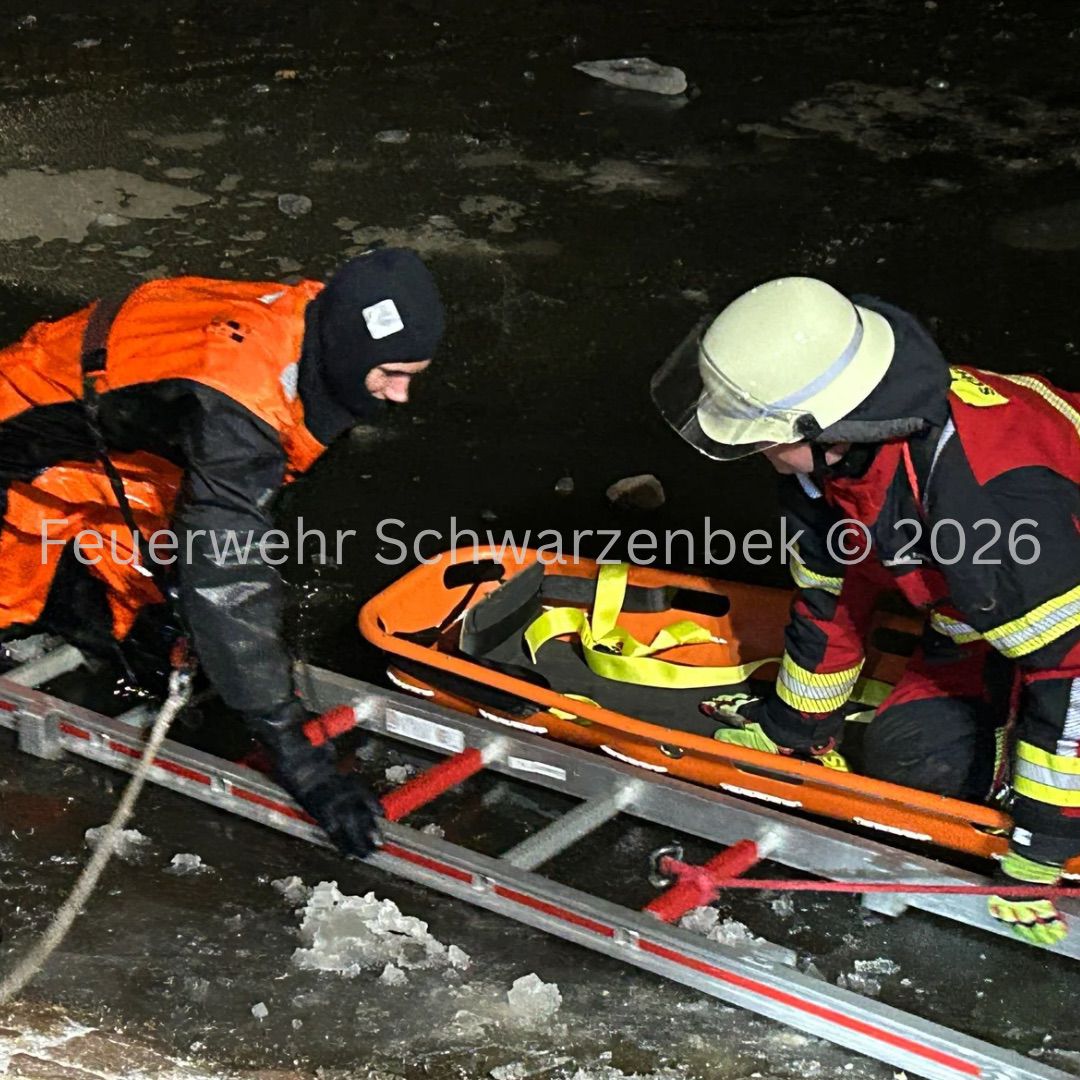 Auch wenn die Eisfläche stabil und tragfähig wirkte, brachen im Rahmen der Übung zwei Kameraden, geschützt durch Überlebensanzüge, bewusst ins Eis ein, um die Rettungsmaßnahmen unter möglichst realistischen Bedingungen durchführen zu können. Mit Hilfe von Steckleitern, Sicherungsleinen sowie spezieller Schutzausrüstung, darunter eine Schleifkorbtrage, arbeiteten sich die Einsatzkräfte vorsichtig über die Eisfläche vor, um die verunglückte Person zu retten. Dabei standen Teamarbeit, konsequente Eigensicherung sowie ein ruhiges und koordiniertes Vorgehen im Fokus. Solche Übungen sind besonders wichtig, um im Ernstfall schnell und professionell helfen zu können. Gerade bei Eisunfällen zählt jede Minute. Gleichzeitig appellieren wir eindringlich daran, zugefrorene Gewässer nicht zu betreten. Auch wenn Eisflächen stabil wirken, sind sie in der Regel nicht tragfähig und stellen eine erhebliche Lebensgefahr dar. Ein besonderer Dank gilt der DLRG Oberelbe für die Bereitstellung der Überlebensanzüge! |