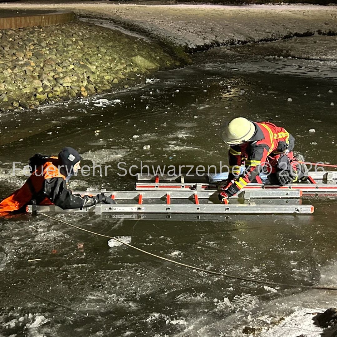 Das zugefrorene Gewässer unter der Europabrücke am Stadtpark bot gestern realistische Bedingungen für einen Übungsdienst zum Thema Eisrettung. Ziel der Ausbildung war es, das schnelle und sichere Retten von ins Eis eingebrochenen Personen zu trainieren.