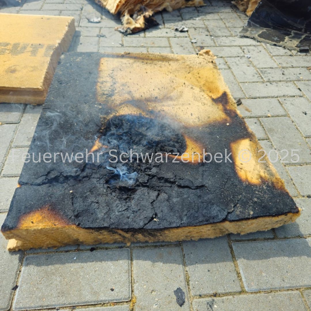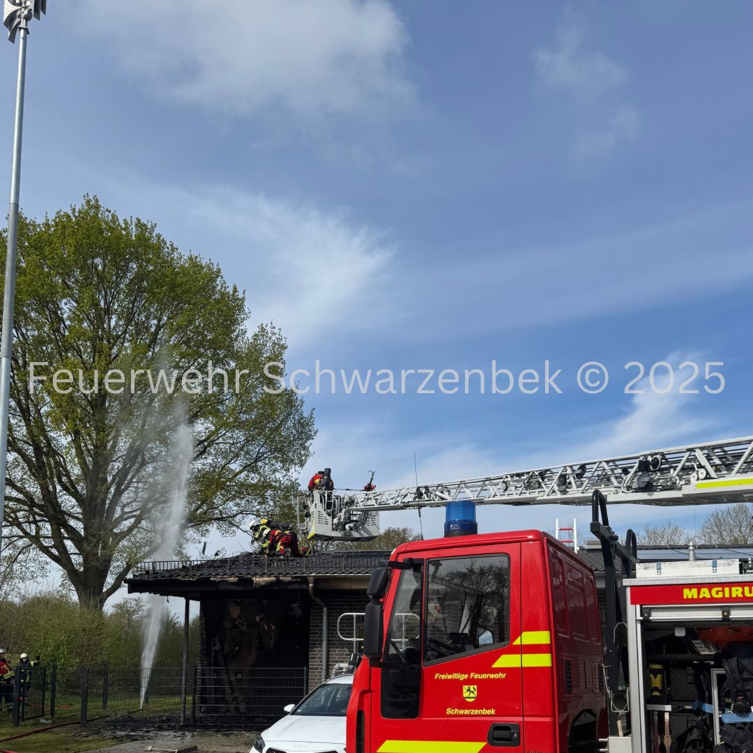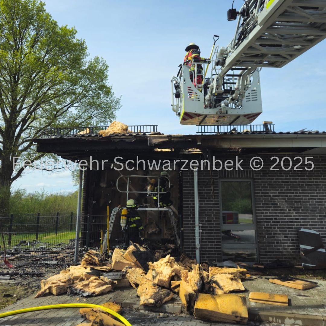 Mit dem Stichwort "Feuer, größer als Standard – Fassade brennt" wurden wir am 24.04.2025 um 10:42 Uhr durch die Leitstelle Süd gemeinsam mit den Feuerwehren aus Trittau, Grande und Witzhave nach Trittau alarmiert. Beim Eintreffen der ersten Kräfte stellte sich die Lage als Brand eines Unterstands bzw. eines Fassadenbereichs heraus. Das Feuer hatte sich bereits in den Dachstuhl ausgebreitet. Wir unterstützten vor Ort bei der Brandbekämpfung über unsere Drehleiter. Im weiteren Einsatzverlauf wurden weitere Glutnester entdeckt, wodurch sich die Nachlöscharbeiten deutlich verlängerten.
